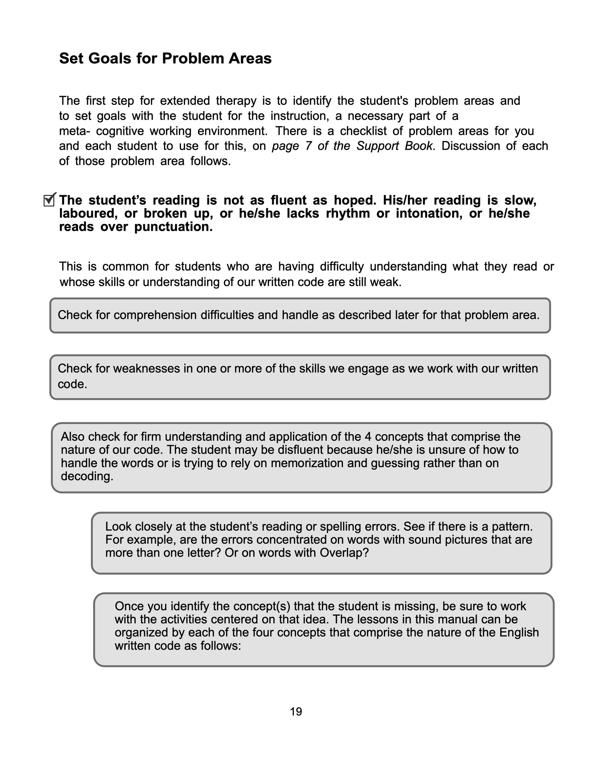 In our research, we found that 98% of students reached grade-level word reading in an average of 12 clinical hours of instruction. But of course some students require extra, ongoing, or review work in the concepts and skills needed for fluent reading and spelling. This Instruction Manual and its accompanying Support Book for Extended Students are designed to give you the tools necessary for those who need more from you than just a 12-week course.
